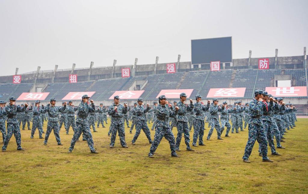 的军训成果汇报演出分为匕首操表演方阵和分列式方阵两个环节。匕首操表演在一声势震虹霄的“杀——”中拉开序幕。一招招前刺,一式式侧踹,伴随着鼓点,三营十三连的战士们动作干脆利落,刀起刀落之间,尽显青春一往无前的锐气。