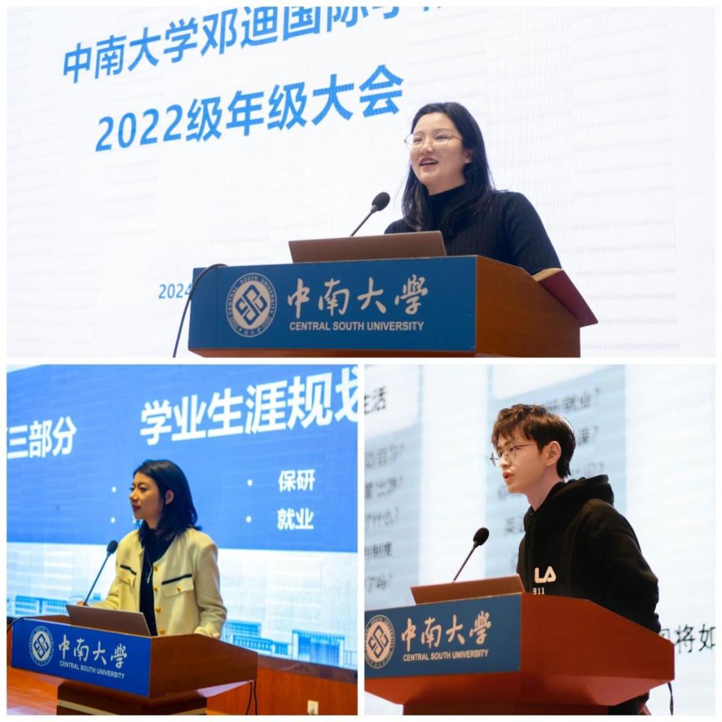 随后,各年级辅导员为同学们进行学业生涯规划的详细指导,并开展安全教育,从请假报备、宿舍用电防火、交通安全等几个方面向同学们提出了要求。在2022级和2023级年级会上,范帆和毛纤雨分别对中南大学的保研政策、考研流程以及大学生就业路径进行了细致地介绍。在2024级年级会上,曹阳向同学们详细介绍了转专业流程与政策,并为同学们说明了暑期学校的相关情况。同学们就会议内容积极提问,与会老师细心解答了同学们的疑惑。
