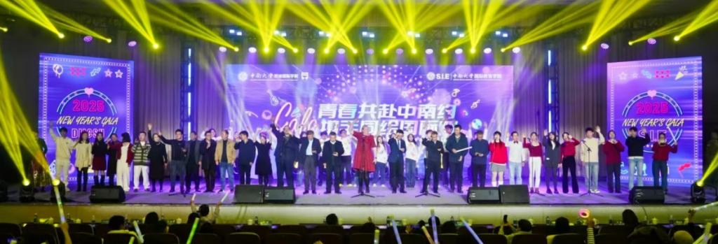 于中南讲堂联合举办“青春共赴中南约,携手同绘国际梦”2025新年晚会。校领导李景升、何军、黎志宏出席,相关部门领导、两院中外方师生以及部分学生家长共800余人参加晚会。