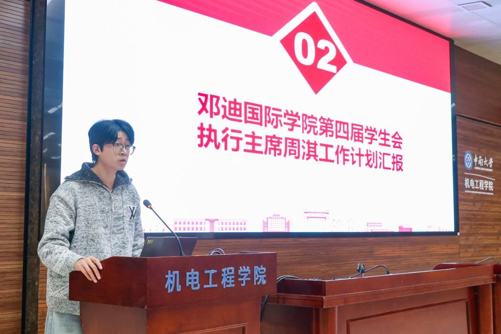 文化建设等方面取得的成果,并对全体成员的辛勤付出表示肯定。随后,第四届学生会执行主席周淇代表新一届学生组织做工作展望。他提到,新一届学生组织将围绕三个方面开展工作:一是坚守服务初心,提升服务质效,做同学信赖的“贴心人”;二是强化组织建设,凝聚团队力量,打造高效协作的“战斗集体”;三是立足国际特色,创新活动形式,打造独具风格的“校园品牌”。