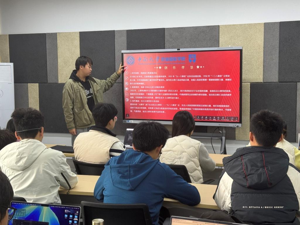 活动伊始,肖茗玮向在场同学介绍了本次学习的核心目标,即通过系统学习《义勇军进行曲》相关知识,强化青年学子的国家认同感与爱国情怀。在创作背景学习中,同学们了解到这首歌诞生于民族危亡的关键时期,其创作与抗日救亡运动紧密相连,是无数仁人志士奋勇抗争的精神写照;在时代意义解读环节,大家明晰了其从抗战文艺作品到成为国歌并写入宪法的历程,深刻认识它所承载的铭记历史、凝聚民心、奋勇前行的精神价值。